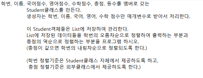 if(std1.getSum() > std2.getSum()) { //std1의 총점이 크면 std1이 std2보다 앞에 위치하도록 -1 반환
